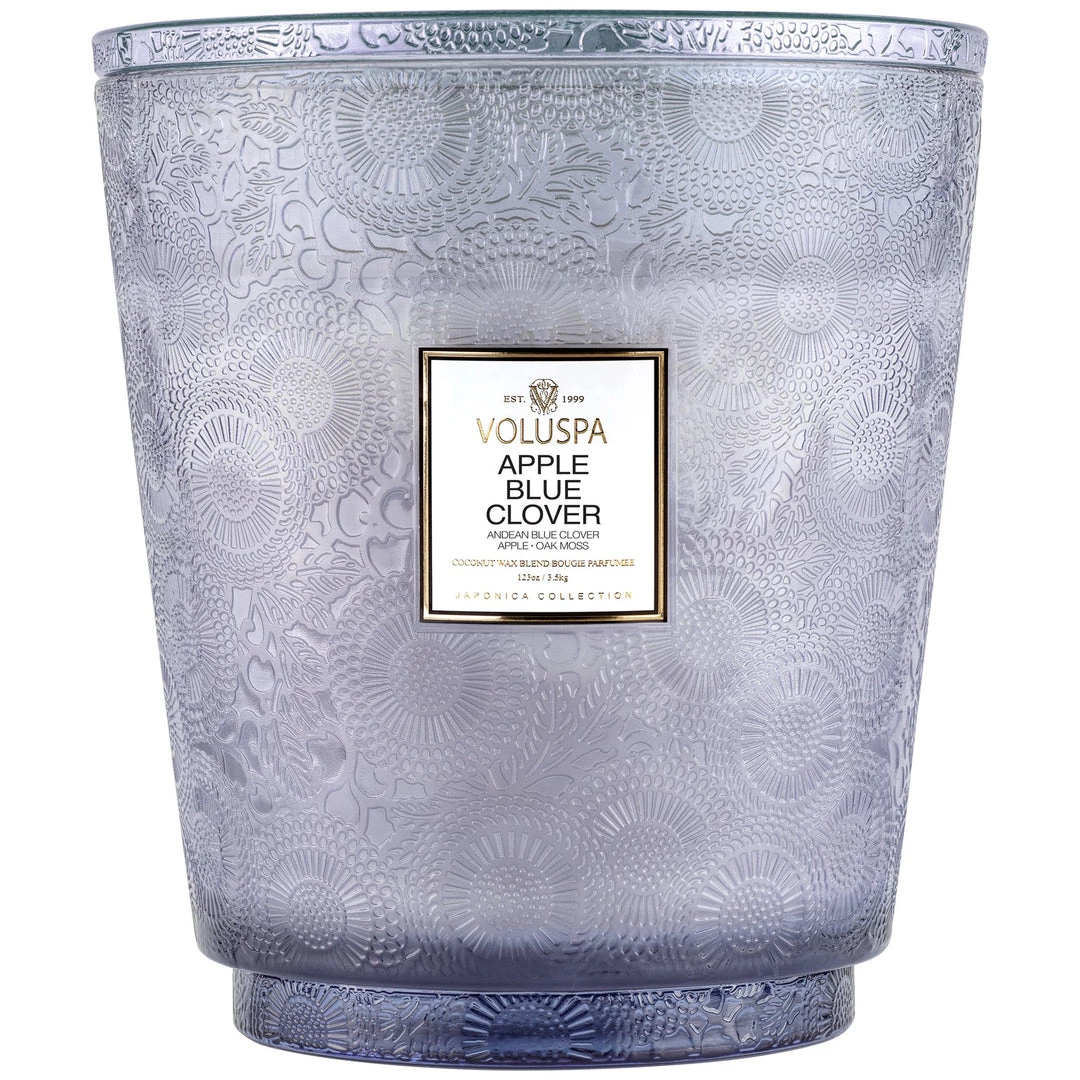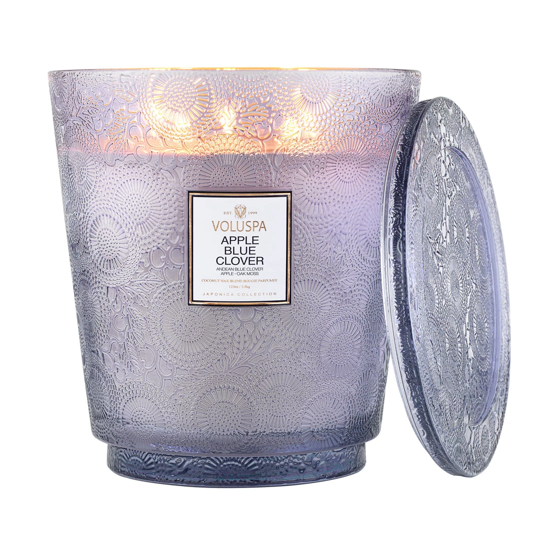 The crown jewel of the Japonica Collection. Experience our largest format in an intricately embossed glass design, fragrance is sent wafting from each of its five wicks. Use the lid to protect from dust while not in use, or as a decorative tray while burning. Repurpose the container long after the candle is gone for keepsakes or decor.