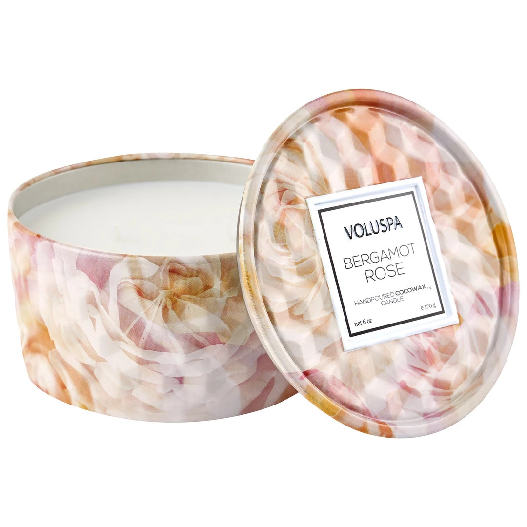A tin candle completely embossed with a 3D geometric cube pattern and packaged to match the rose-inspired fragrance.