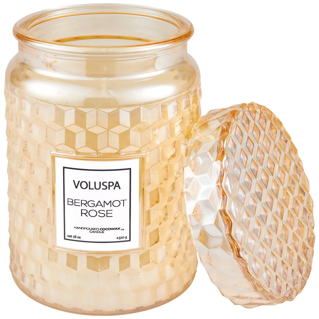 One wick custom glass candle with matching glass lid. Voluspa’s best-selling format gets an update with a 3D geometric cube pattern! You’ll love using the jar for jewelry, flowers or decor long after the candle is gone.