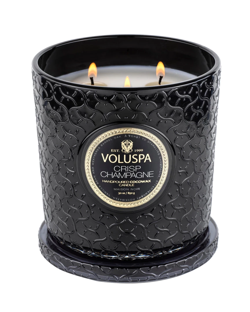 There is no shortage of luxury in our Maison Luxe Jar Candle. Voluspa’s signature Maison pattern wraps the vessel in an elegant emboss from base to lid. The triple wick configuration transforms the ambience with its reflective glow, creating a generous wax pool to ensure abundant fragrance throw. As a finishing touch, the candle is perfectly designed to fit in the depression of the lid when lit.
