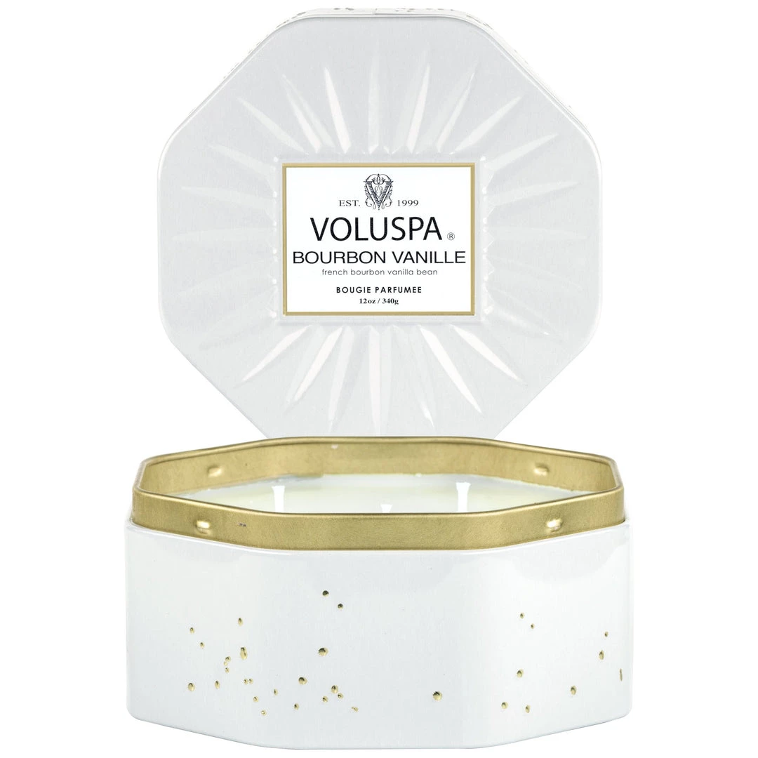 This beautiful, 3 wick octagonal tin candle adds elegance to any room. Complete with matching lid, the luxe gold interior provides a subtle yet decisive flair, a nod to the 1920’s glass that inspired it.