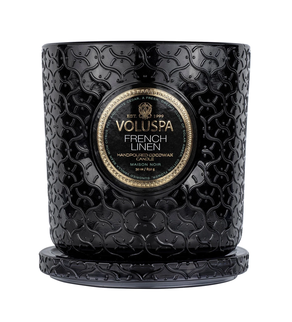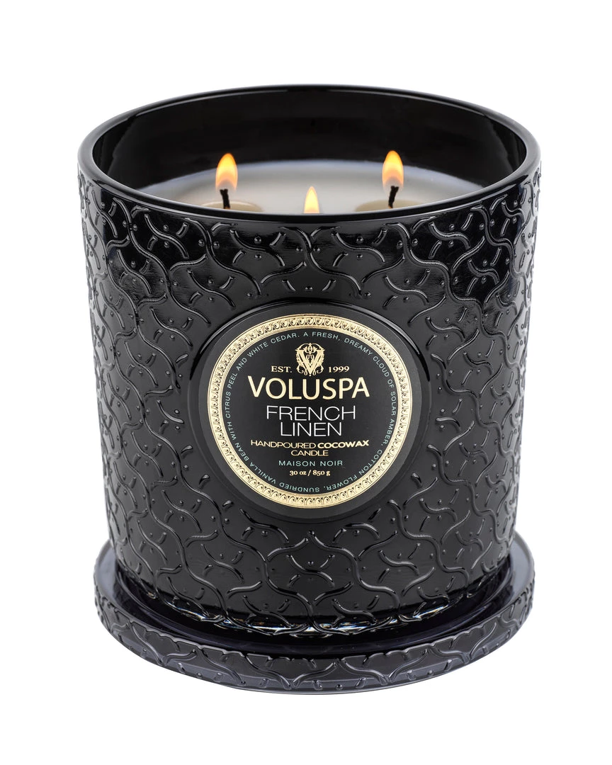 There is no shortage of luxury in our Maison Luxe Jar Candle. Voluspa’s signature Maison pattern wraps the vessel in an elegant emboss from base to lid. The triple wick configuration transforms the ambience with its reflective glow, creating a generous wax pool to ensure abundant fragrance throw. As a finishing touch, the candle is perfectly designed to fit in the depression of the lid when lit.
