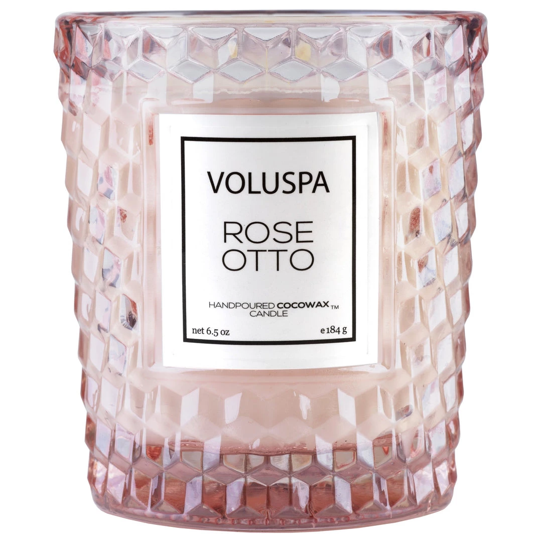 This Classic Candle is delicately sized for any space! The Roses Collection glass is textured with a classic geometric 3D cube pattern and colored to match the rose that served as fragrance and packaging inspiration.