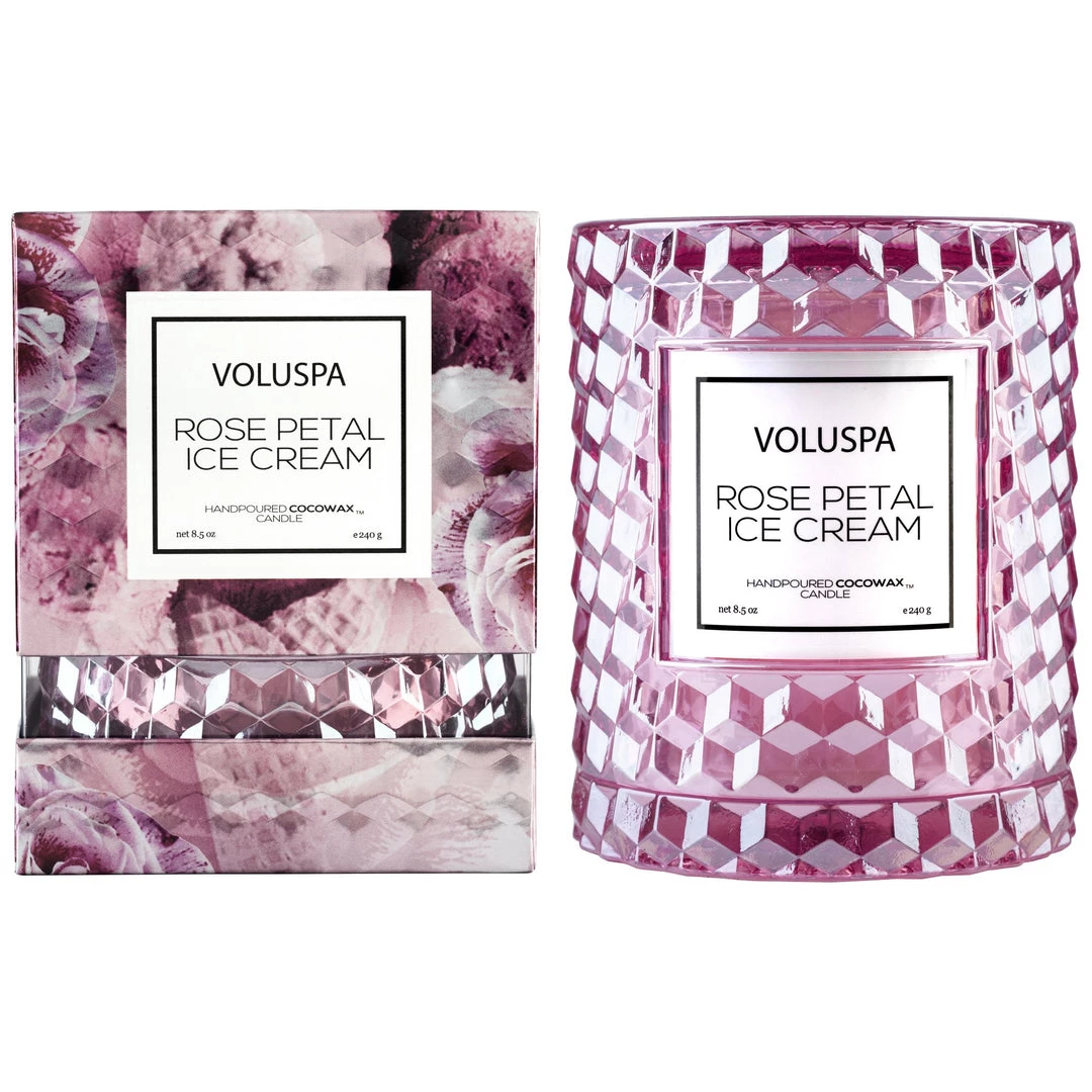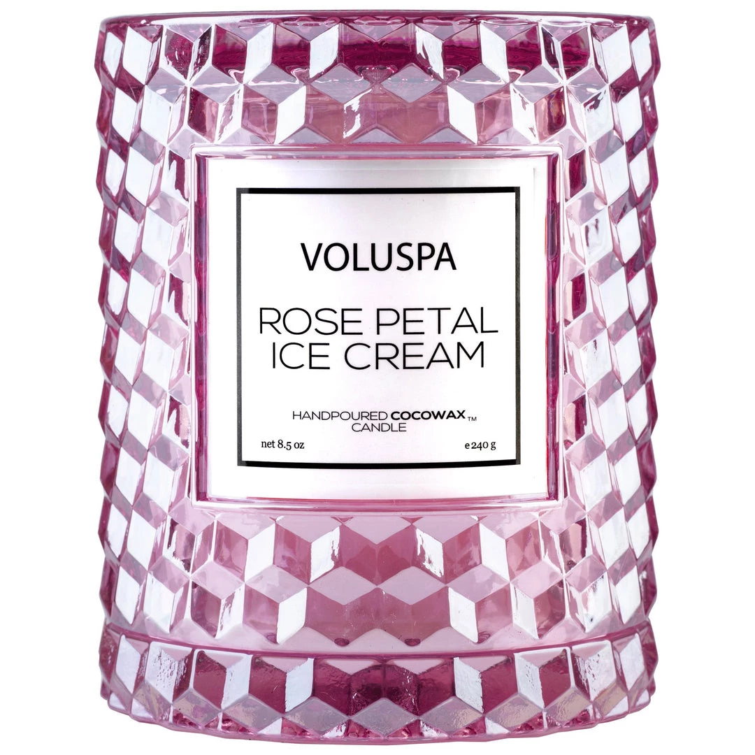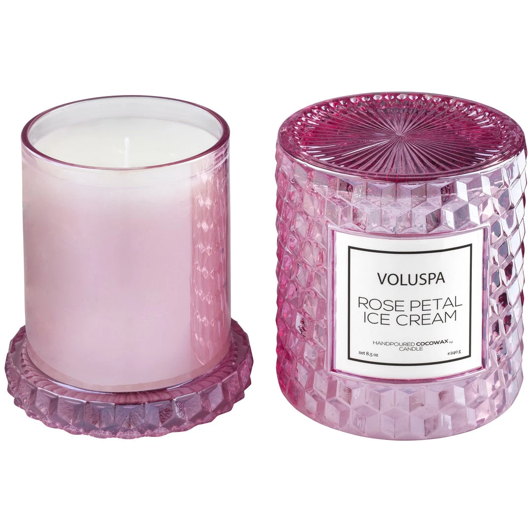An artistically designed candle glass and cover, the ultimate in functional beauty. This unique candle is an instant upgrade to any space. Use the cover to protect the candle while not in use, or as an easy way to extinguish the flame. This Roses Collection cloche candle has a classic 3D cube pattern and is colored to match the rose that served as fragrance and packaging inspiration.