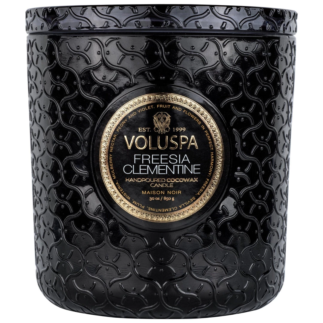 There is no shortage of luxury in our Maison Luxe Jar Candle. Voluspa’s signature Maison pattern wraps the vessel in an elegant emboss from base to lid. The triple wick configuration transforms the ambience with its reflective glow, creating a generous wax pool to ensure abundant fragrance throw. As a finishing touch, the candle is perfectly designed to fit in the depression of the lid when lit.