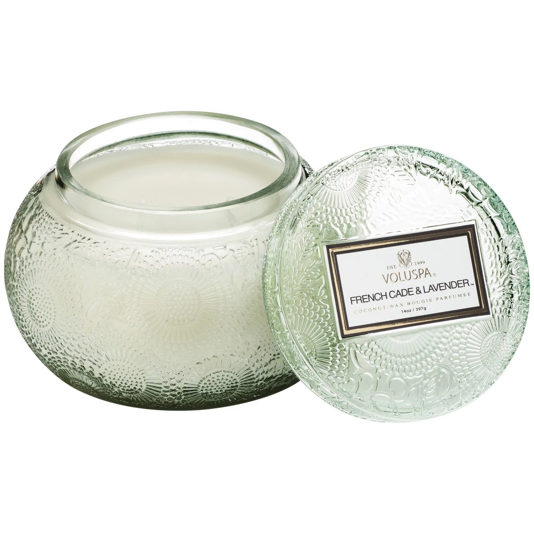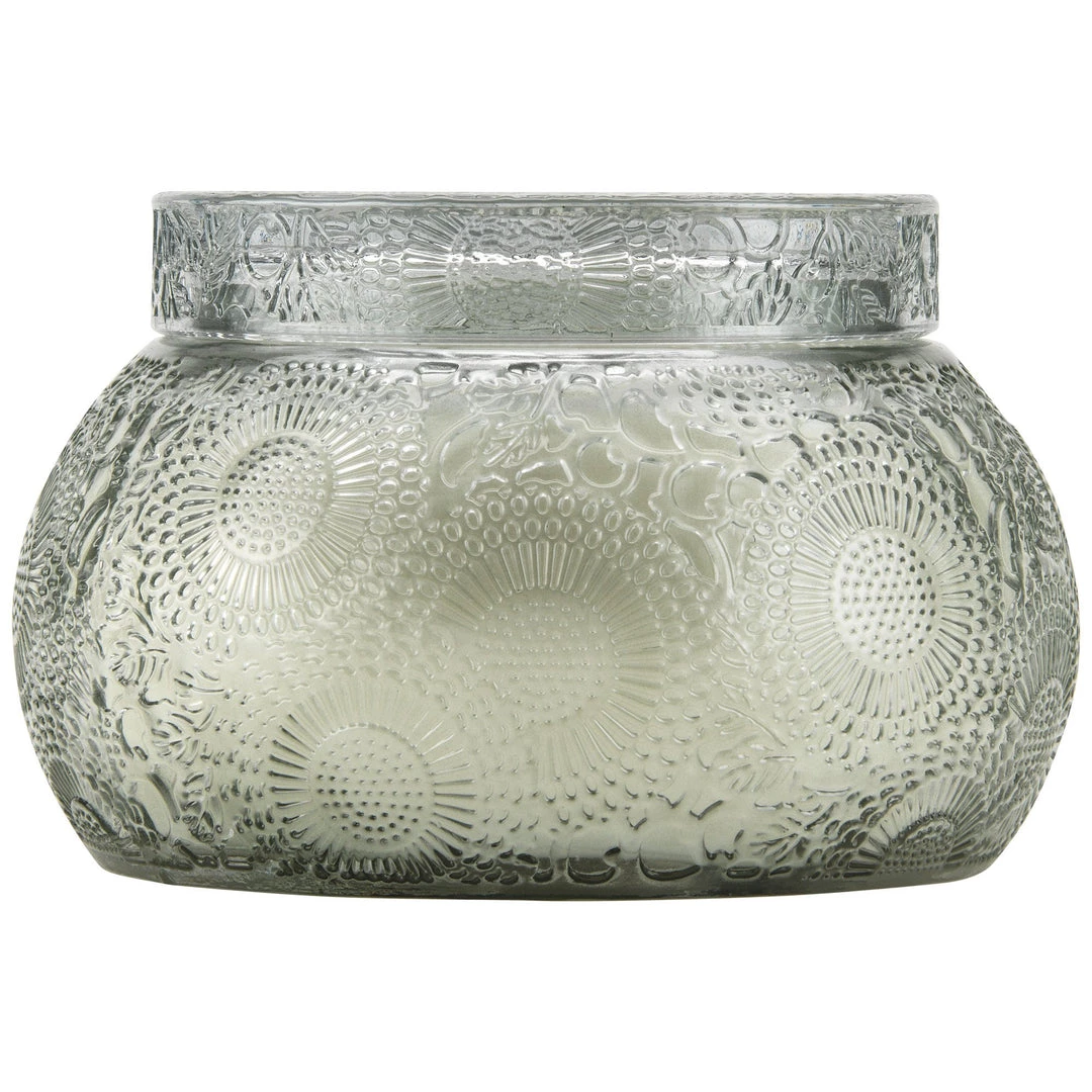 Its richness in both aroma and design is showcased in a lidded glass bowl; an ode to Japanese beauty. Embossed with salient detail, the container is a perfect centerpiece while accessorizing a space, as the clean burn delivers fragrance to every corner.