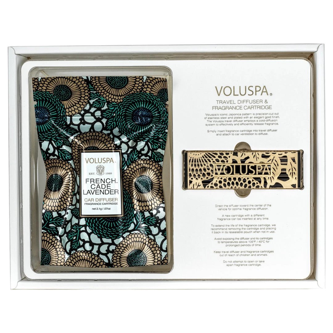Voluspa’s iconic Japonica pattern is precision-cut out of stainless steel and plated with an elegant gold finish. The Voluspa travel diffuser employs a cold-diffusion system to effectively and efficiently release fragrance.