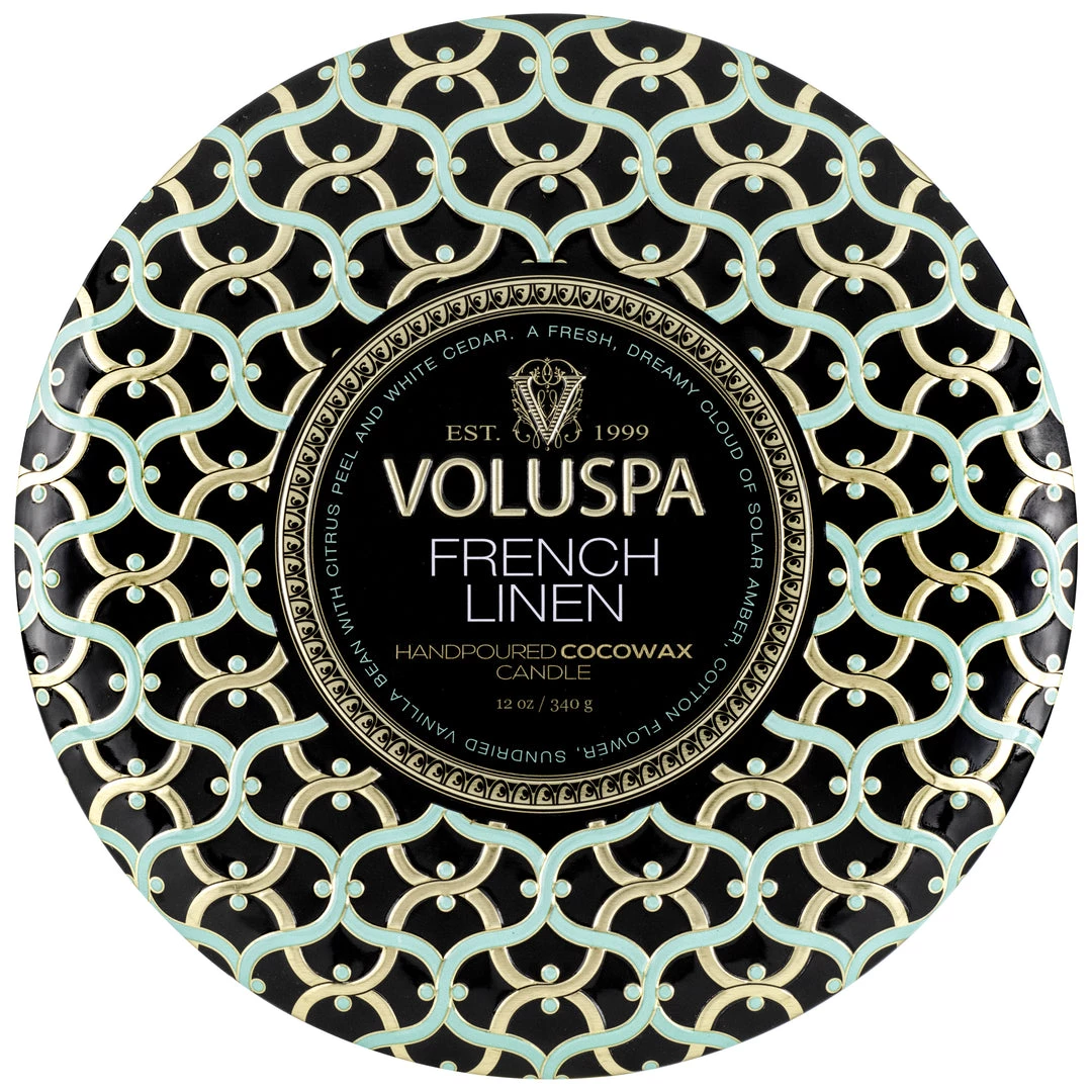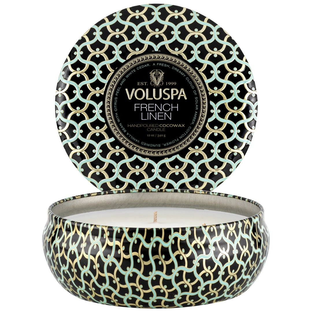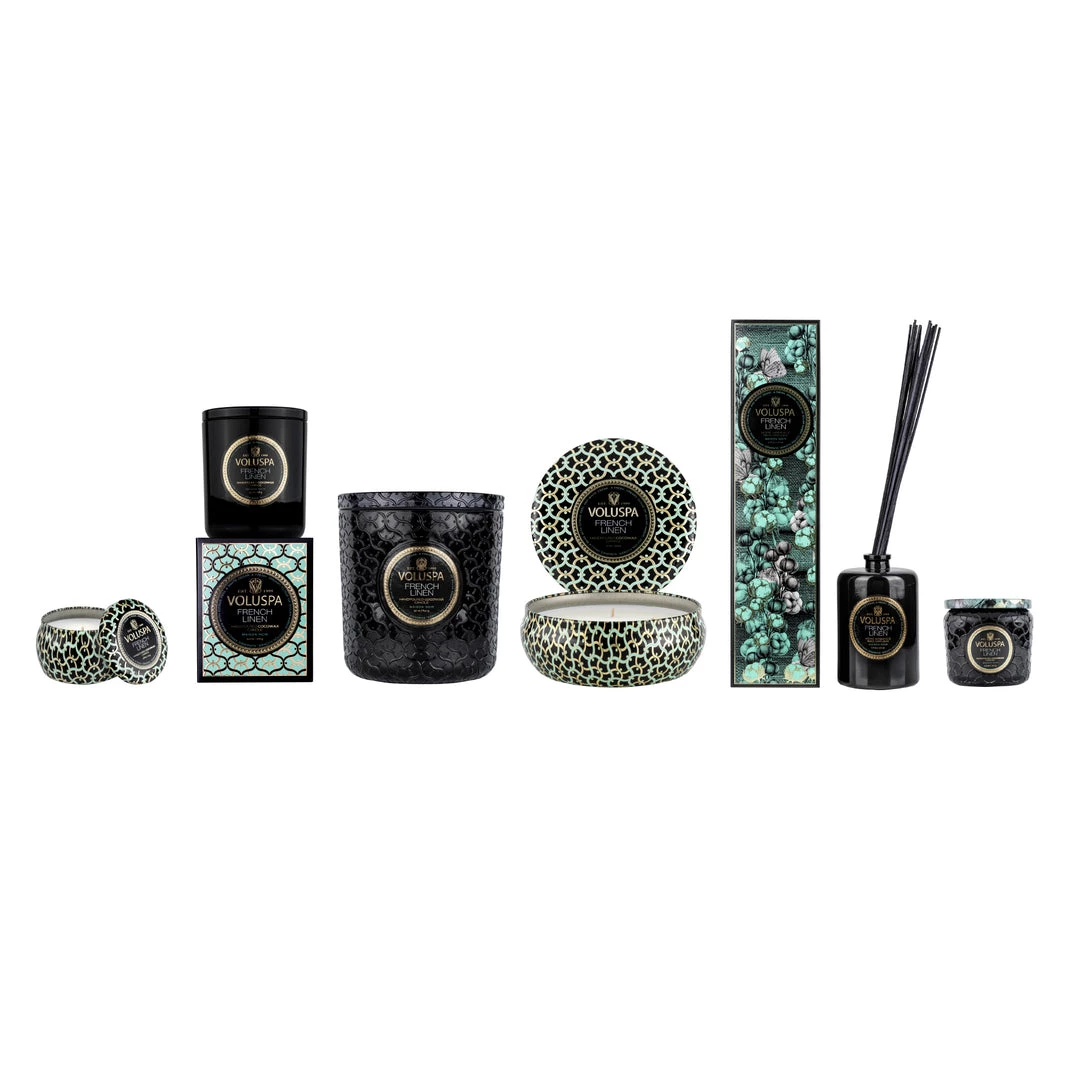 Our iconic tin takes on a new look and feel adorned in the Maison pattern emboss. A graceful urn-shaped container featuring three wicks creates a generous melted wax pool and ample fragrance throw while burning. This 12 ounce tin makes a statement on its own and includes a coordinating lid, which can be used to extinguish the flame.