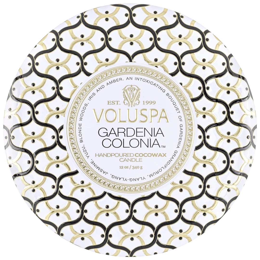 Our iconic tin takes on a new look and feel adorned in the Maison pattern emboss. A graceful urn-shaped container featuring three wicks creates a generous melted wax pool and ample fragrance throw while burning.This 12 ounce tin makes a statement on its own, and includes a coordinating lid, which can be used to extinguish the flame.