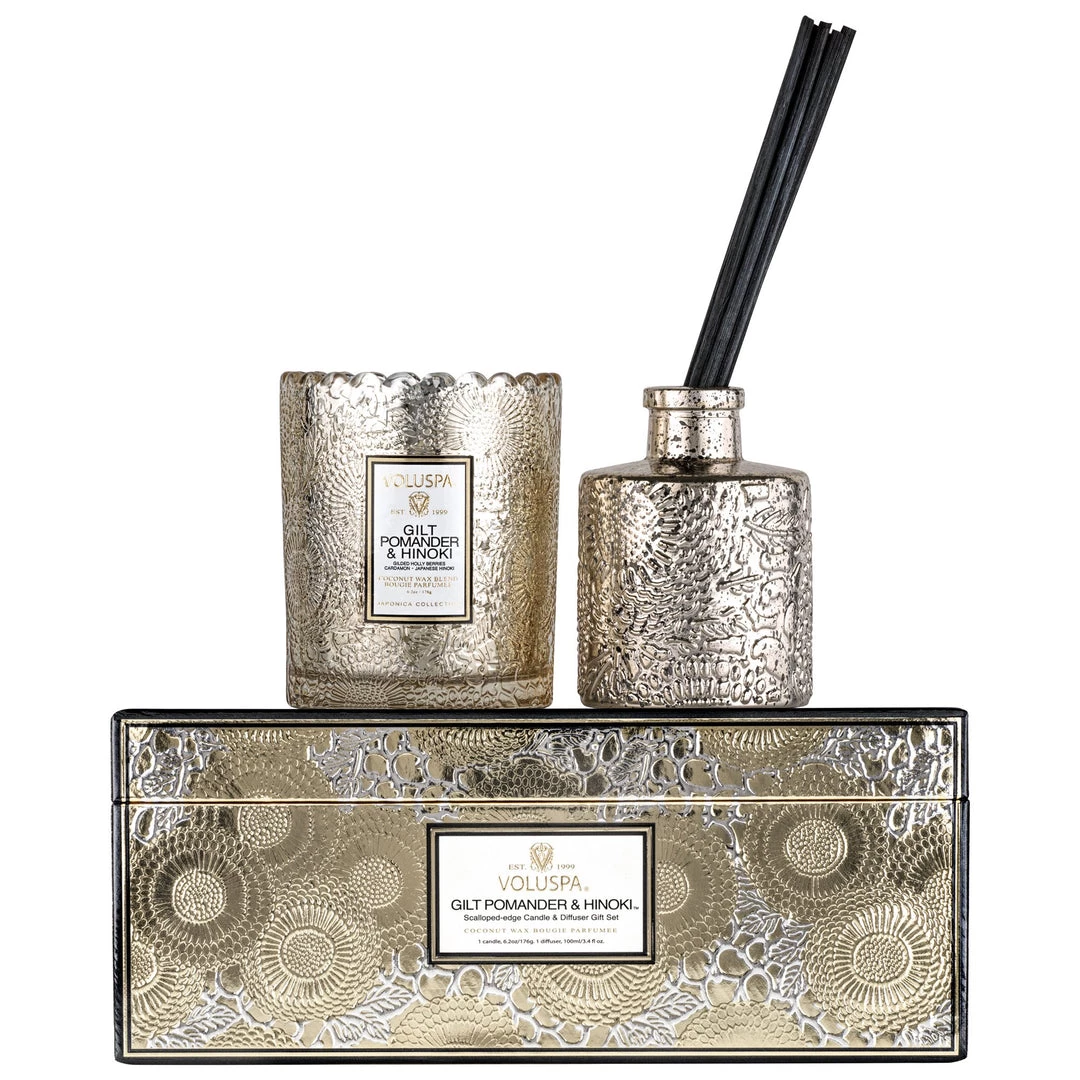 The outer box is embossed in the iconic Japonica wood block pattern and colored by fragrance. The inside contains one scalloped edge candle and one colored diffuser with 10 fine-gauge black reeds.