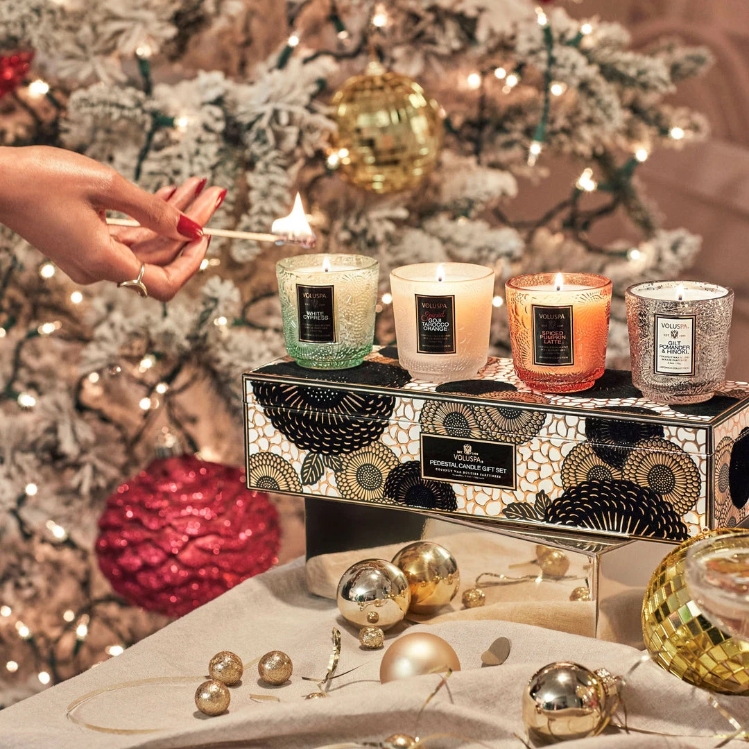 Light up the holiday season with an elegant offering from the JaponicaHoliday Collection. This chic gift set highlights Voluspa’s essential holiday fragrances: Spiced Goji Tarocco Orange, Spiced Pumpkin Latte, Gilt Pomander & Hinoki and White Cypress. Burn one, blend two or scatter them around the home. Spoil a loved one or yourself with this luxe holiday gift- no wrapping required