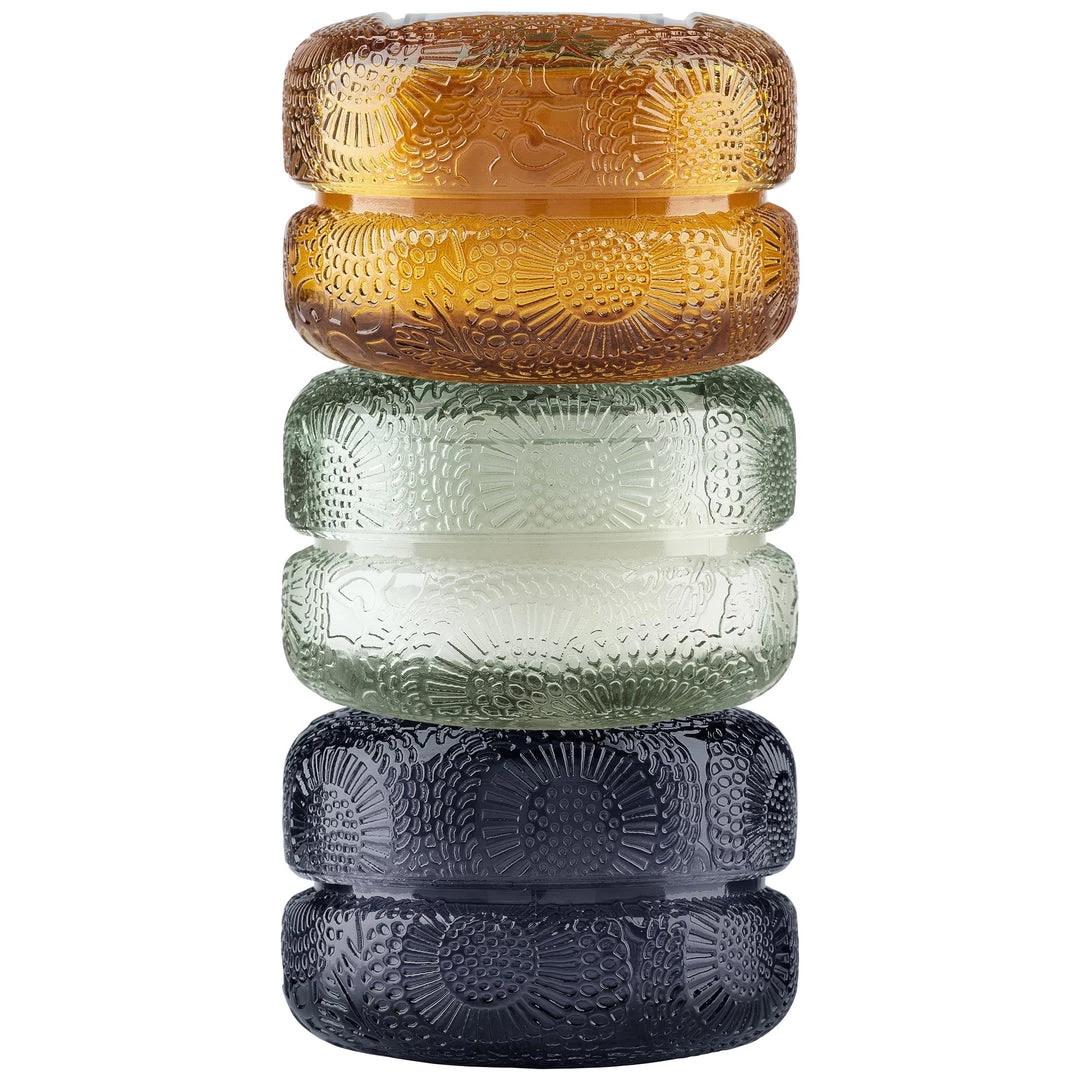 | Gift Set Includes Baltic Amber, French Cade Lavender, Moso Bamboo. The Japonica Collection glass is embossed in an intricate design, inspired by Japanese paper making. Stack them, pile them up, always use more than one, because who’s counting? Burn Time: ~ 15 Hours Fill: 1.8 oz.each UPC: 806644729198 |