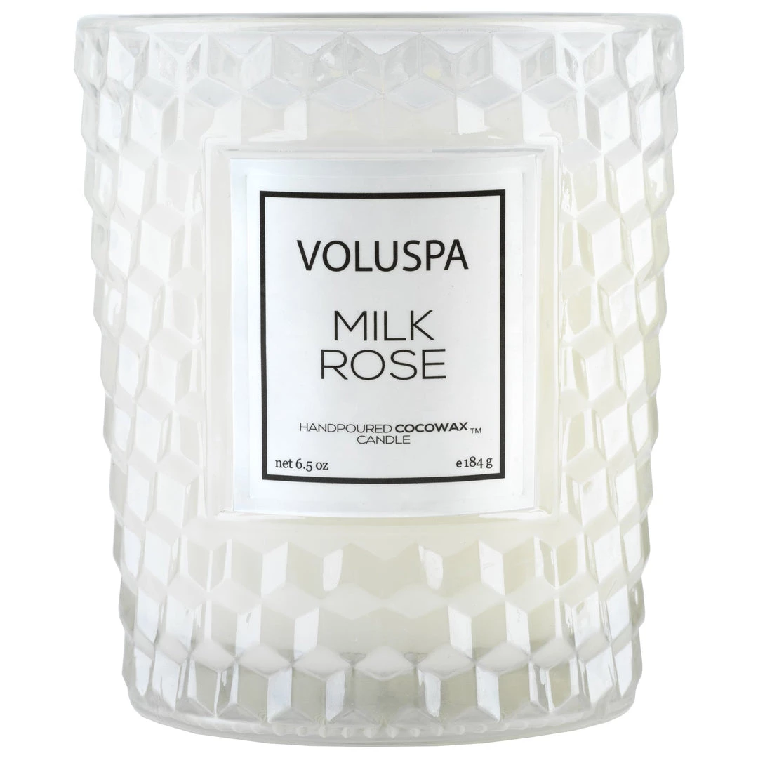 This Classic Candle is delicately sized for any space! The Roses Collection glass is textured with a classic geometric 3D cube pattern and colored to match the rose that served as fragrance and packaging inspiration.