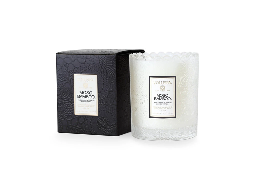 Intricate scalloped edges adorn this embossed glass candle, creating a captivating glimmer and glow. A jewel within our Japonica collection and inspired by the beauty of Japanese paper making, its design is as mesmerizing as the glow it emits. The container will live on in your home as a dazzling accent piece.