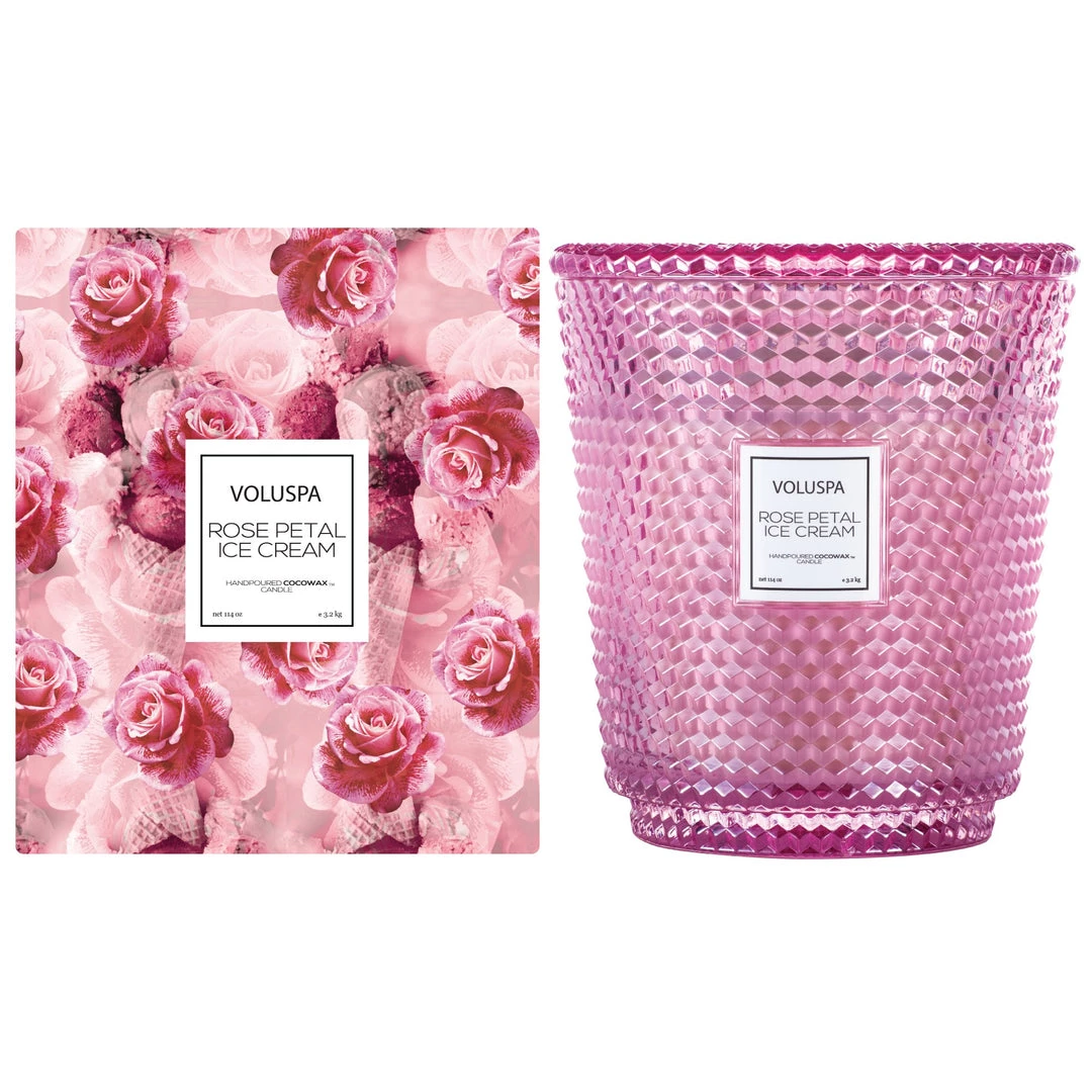 Our largest format! A 5-wick gorgeous glass candle embossed with a classic 3D geometric cube pattern, colored to match the rose-inspired fragrance and packaging.