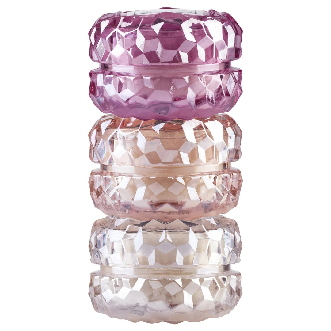| Gift Set Includes Rose Petal Ice Cream, Rose Colored Glasses, Rose Otto. The Roses Collection glass is textured with a classic geometric 3D cube pattern and colored to match the rose that served as fragrance and packaging inspiration. Stack them, pile them up, always use more than one, because who’s counting? Burn Time: ~ 15 Hours Fill: 1.8 oz.each UPC: 806644053927 |