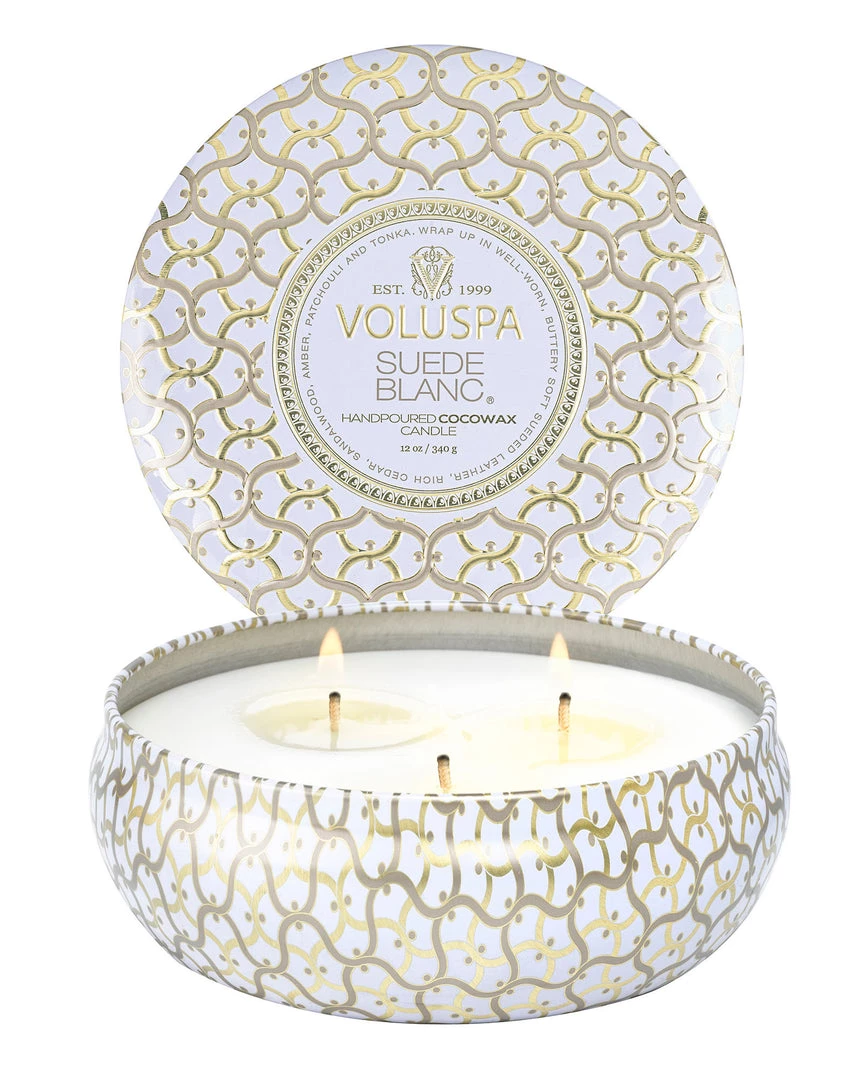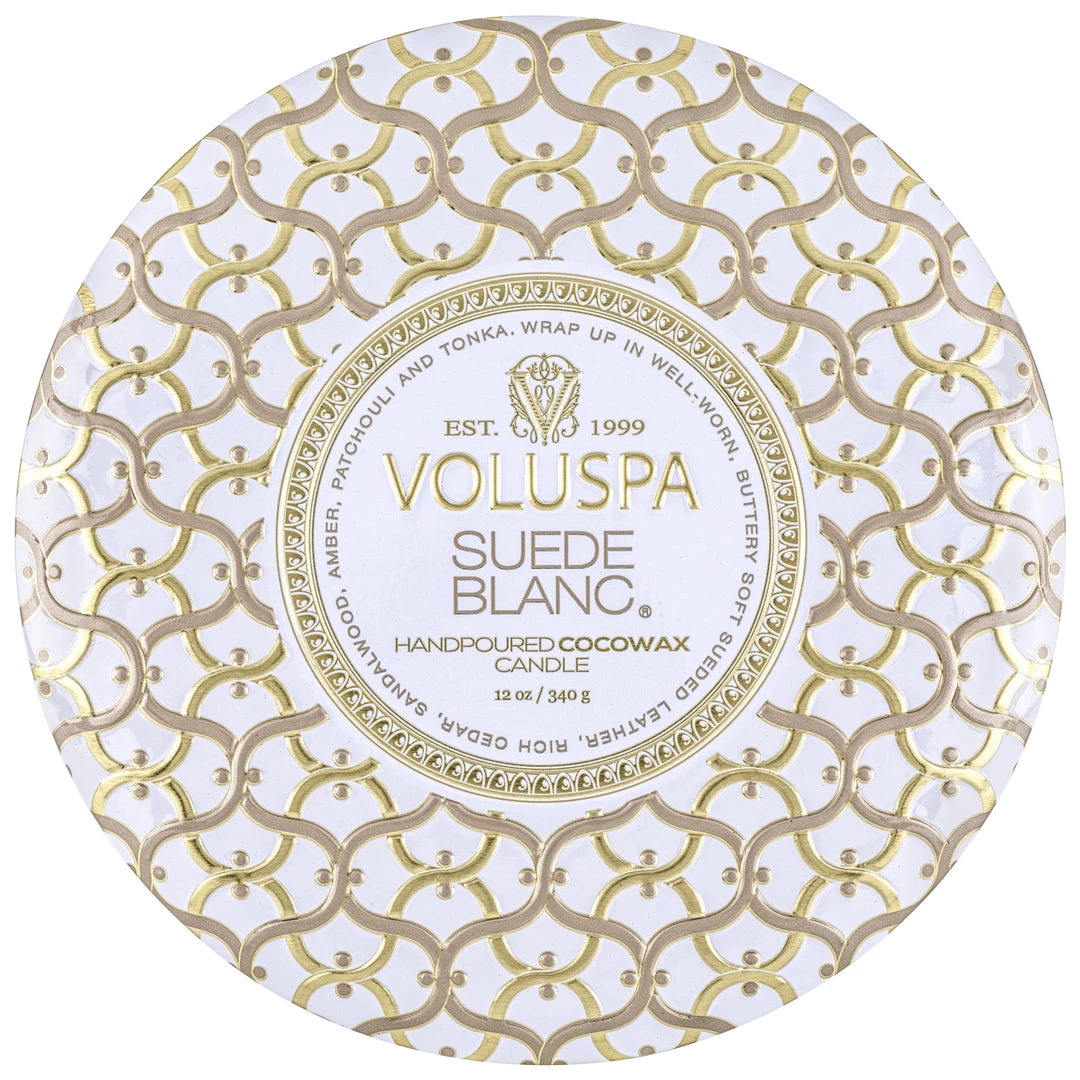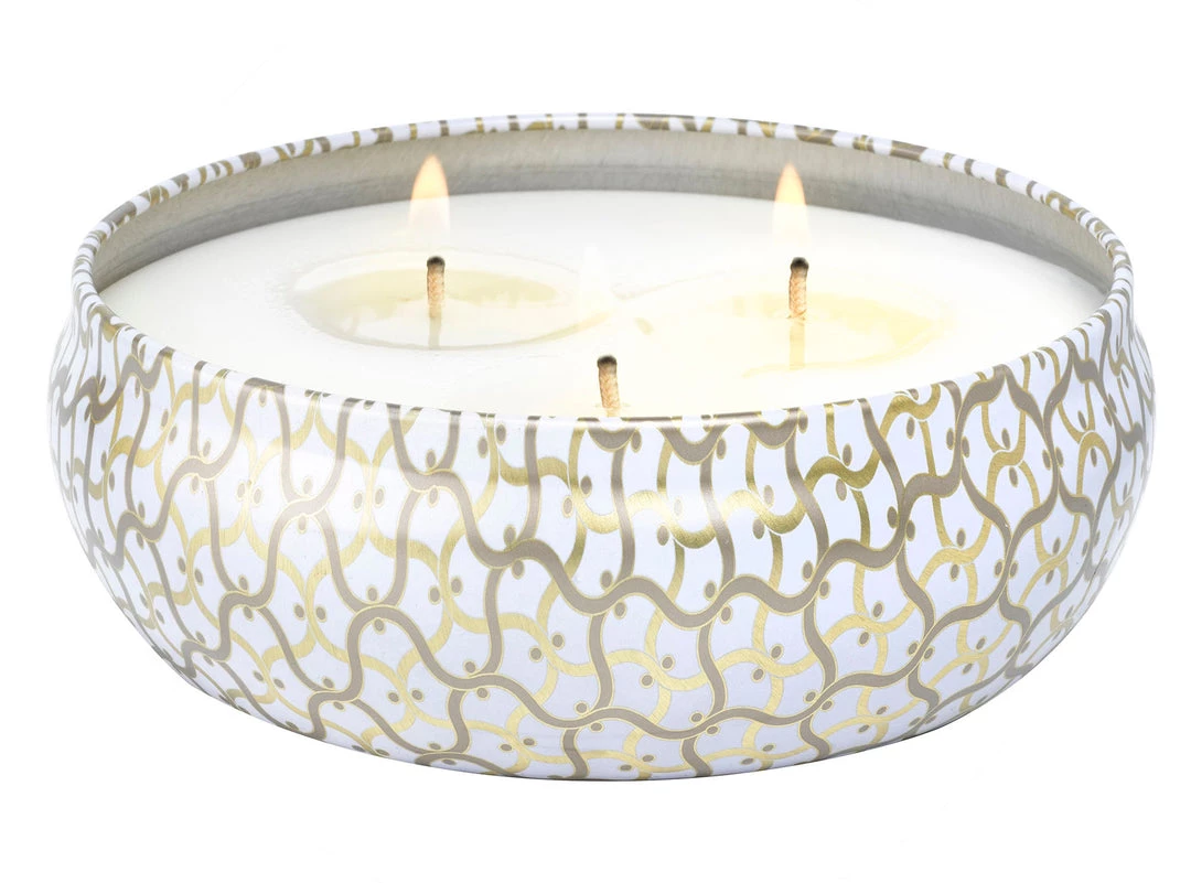Our iconic tin takes on a new look and feel adorned in the Maison pattern emboss. A graceful urn-shaped container featuring three wicks creates a generous melted wax pool and ample fragrance throw while burning.This 12 ounce tin makes a statement on its own, and includes a coordinating lid, which can be used to extinguish the flame.